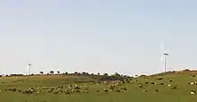 Wind power uses wind turbines to produce electric power. Wind levels vary depending on factors such as terrain, bodies of water and vegetative cover.[21] Wind turbines convert the wind into kinetic energy and mechanical power.[21] The wind turns 50-metre-long blades attached to 80 metre-high shafts that generate the electric energy.[22] Wind turbine farms can range between 10MW to over 100 MW and produce energy when the wind is between 13–90 km/h.[23] Wind turbines farms can be onshore or offshore. Offshore have stronger winds and less visual impact.[24] In 2014 the first major wind farm became operational with approximately 10 either operational or in construction today. South Africa's extensive coastline and geographical terrain including lowlands and high veld escarpment, provide wind energy that can be extracted and generated into off-the-shelf technology.[5] There are currently 19 wind energy developments in South Africa with more than 600 wind turbines.[25] On the international scale, South Africa ranks as having fair to reasonable wind resources.[5] Wind power is a renewable, widely distributed and clean form of energy. The production of wind energy does not produce greenhouse gases and is an alternative to burning fossil fuels.[26]