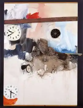 Reservoir is a 1961 painting by American artist Robert Rauschenberg.[1] The work is one of his Combines, which incorporate both two- and three-dimensional found, non-art materials, using objects Rauschenberg collected from the streets of his lower Manhattan neighborhood.[2] Reservoir is in the collection of the Smithsonian American Art Museum, in Washington, D.C. According to the museum, the artwork incorporates a length of wood, two clocks, and two cast-off wheels which evoke the always changing and surprising contrasts of everyday experience. The seemingly spontaneous arrangement of objects and the quick, gestural brushstrokes evoke the legacy of Abstract Expression. The two clocks record the time he started making the artwork and the moment he considered it finished.[3][4]