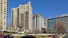 In late 2015, Boston Properties broke ground for the redevelopment of the surface parking lot north of Fountain Square. The Signature apartments, a pair of high rise residential towers, opened on the site in February 2018.[8] Soon thereafter construction began across President's Street for a glass-clad office tower dubbed 17Fifty. The 17-story building took the place of low-rise retail built during the initial phase and opened in 2020.[9][10]