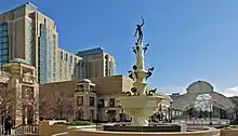 Reston Town Center is designed with open avenues and wide sidewalks. It is built around Fountain Square, a medium-sized open area between the surrounding shops. The main landmark in Fountain Square is Mercury Fountain, designed by Saint Clair Cemin. Directly in front of Mercury Fountain is Market Street, and across the street is the Pavilion. The Pavilion doubles as a covered open-air ice rink during the winter and as a concert and event venue throughout the rest of the year. Adjacent to the fountain are the One & Two Fountain Square buildings with the One & Two Freedom Square buildings located one block to the west. Street parking is available throughout, and seven public parking garages surround the center. As of 2019, Reston Town Center's "downtown" area has more than 50 retail shops and 30 restaurants. In addition, Reston Town Center has a 13-screen cinema which was renovated in 2012, and a Hyatt Regency hotel. Since the most recent major phase of construction in 2009, Reston Town Center, in the past known more for its shopping, dining, and entertainment, has developed into a location for businesses and residences also. High-rise condominiums have led to an influx of young professionals.