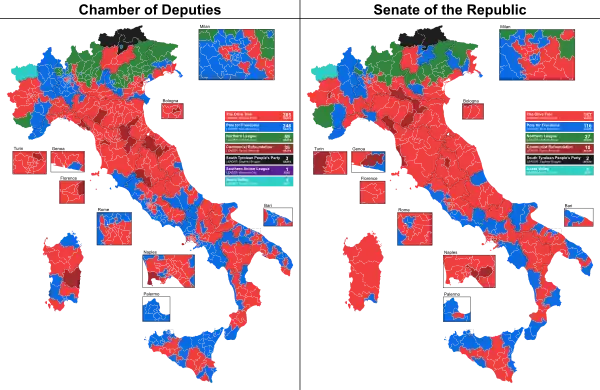 Results for the Chamber of Deputies (left) and Senate of the Republic (right) in single-member constituencies. The colour corresponds to the party or coalition that won the constituency. Red represents The Olive Tree, blue the Pole for Freedoms, green the Northern League, dark red the Communist Refoundation Party, black the South-Tyrolean People's Party, indigo the Southern Action League, and turquoise the Aosta Valley coalition.