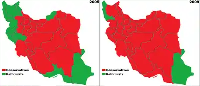 Provinces that won a conservative majority in red and provinces that won a reformist majority in green. Results of 2005 on the left and of 2009 on the right.
