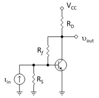 Figure 1 (top right) shows a bipolar amplifier with feedback bias resistor Rf driven by a Norton signal source. Figure 2 (left panel) shows the corresponding small-signal circuit obtained by replacing the transistor with its hybrid-pi model. The objective is to find the return ratio of the dependent current source in this amplifier.[9] To reach the objective, the steps outlined above are followed. Figure 2 (center panel) shows the application of these steps up to Step 4, with the dependent source moved to the left of the inserted source of value it, and the leads targeted for cutting marked with an x. Figure 2 (right panel) shows the circuit set up for calculation of the return ratio T, which is