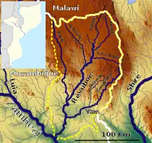 Originating in the highlands along Mozambique's northern border with Malawi, the Revúboé flows south for several hundred kilometers through the rugged countryside.[1] On its way south, the river is fed by a number of smaller rivers, most notably the Ponfi and Condedezi rivers.[2] The Revuboe mouths at the left bank of the Zambezi River near the city of Tete.[3]