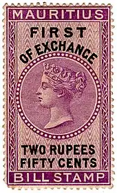 The first bill stamps of Mauritius were issued on 28 March 1869. They were locally lithographed and imperforate, with values ranging from 1d to 16s8d in various colours. They were printed in triplets inscribed First, Second or Third of Exchange for use on triplicate documents. Later that year a new set portraying Queen Victoria was issued, also in triplets. Stamps in this design, with various changes in colour and currency, continued to be used until 1903. In 1904 a new type appeared, similar to the design used for high value postage stamps, but with a blank value tablet and in green. These were then overprinted BILLS ONLY FIRST (or SECOND or THIRD) OF EXCHANGE and the value. Two slightly different formats exist.[1]