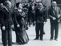 Meanwhile, there was now a growing schism within the CNT and the FAI. Leading figures such as Horacio Prieto and minister of education Segundo Blanco argued for collaboration with the national government. Dissenting anarchists such as Jacinto Toryho, the director of Solidaridad Obrera and FAI delegate Pedro Herrera were harshly critical of this policy. Toryho was removed from his position by the CNT national committee on 7 May 1938.[87] Two months before the fall of Catalonia, a national plenum of the libertarian socialists was held in Barcelona between 16 and 30 October 1938. Emma Goldman was in attendance and she defended the FAI in "opposition to the growing encroachment of the Negrín government on the libertarian achievements".[88] According to José Peirats, Horacio Prieto argued for an "undisguised reformism bordering on Marxism," and that "truly effective action" was only possible through "organs of power."[88] He also criticized the naivete of the anarchists and its "lack of concrete plans."