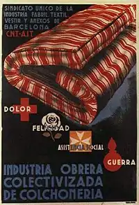 In response to these problems, the Generalitat of Catalonia, backed by the CNT approved a decree on "Collectivization and Workers' Control" on 24 October 1936. Under this decree all firms with more than 100 workers were to be collectivized and those with 100 or less could be collectivized if a majority of workers agreed.[15] All collectivized enterprises were to join general industrial councils, which would be represented in a decentralized planning agency, the Economic Council of Catalonia. Representatives of the Generalitat would be appointed by the CNT to these regional councils.[14] The goal of this new form of organization would be to allow economic planning for civilian and military needs and stop the selfishness of more prosperous industries by using their profits to help others. However these plans for libertarian socialism based on trade unions were opposed by the socialists and communists who wanted a nationalized industry, as well as by unions which did not want to give up their profits to other businesses.[16] Another problem faced by the CNT was that while many collectivized firms were bankrupt, they refused to use the banks because the financial institutions were under the control of the socialist UGT. As a result of this, many were forced to seek government aid, appealing to Juan Peiró, the CNT minister of industry. Socialists and Communists in the government however, prevented Peiró from making any move which promoted collectivization.[17]