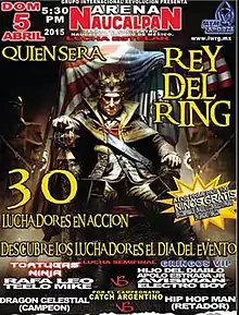 The Mexican professional wrestling company International Wrestling Revolution Group (IWRG; at times referred to as Grupo Internacional Revolución in Mexico) started their annual Rey del Ring ("King of the Ring") event in 2002, creating an annual event around the eponymous Rey del Ring match, a 30-man elimination match similar in concept to the WWE's Royal Rumble match.[2][3] From 2002 until the 2011 event the "prize" for winning the match itself was simply the prestige of outlasting 29 other competitors, but at the 2011 Rey del Ring IWRG introduced the IWR Rey del Ring Championship complete with a belt to symbolize the championship that would be awarded to the winner each year.[4] At that point in time the Rey del Ring title became a championship that could be defended and lost or won in matches in between the annual tournaments. For the tournament the champion would vacate the Rey del Ring Championship prior to the actual Rey del Ring match itself.[5] All Rey del Ring shows, as well as the majority of the IWRG shows in general are held in Arena Naucalpan, owned by the promoters of IWRG and their main arena. The 2015 Rey del Ring was the thirteenth over all Rey del Ring tournament held by IWRG.