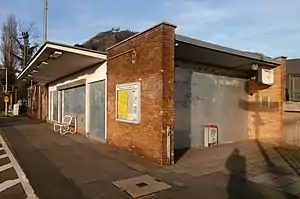 In 2000, 500 passengers used the station each day.[6] In 2005, the area surrounding the platform access to the new bridge over Karl-Broel-Straße was renewed.[7] More recently, the station has lost its operational significance: the ticket office was closed in 2008,[8] a temporary passenger level crossing for the disabled was removed in 2010 and the local train dispatcher was withdrawn at the end of 2011 when an electronic interlocking was installed.[9] In response to this decline, Deutsche Bahn blocked off the former waiting room with steel plates in the spring of 2012. The demolition of the station building was considered and it was subsequently sold.[10][11] A barrier-free upgrade of the station is currently being promoted by the city of Bad Honnef, which could be built on railway property on the side of the railway closest to the Rhine.[12] However, it is not included in any federally-supported program and is therefore expected to be supported by the Zweckverband Nahverkehrs Rheinland (Rhineland local transport association) only in the medium term.[13][14][15]