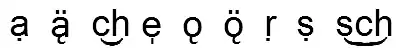 [ç] | German "mich" (me, myself): | mic̲h̲ | U+0043+0332+0048+0332, U+0063++0068+ | |||||||
