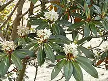 Rhododendron alutaceum is a species of flowering plant in the family Ericaceae.[1] It is native to Tibet and southwestern China (western Sichuan, southeastern Xizang, and northwestern Yunnan), where it grows at altitudes of 3,200–4,300 m (10,500–14,100 ft). This evergreen shrub that grows to 1.5–4 m (4.9–13.1 ft) in height, with thick, leathery leaves that are oblong and broadly lanceolate to lanceolate or narrowly oblong, 5–14 by 1.5–3.5 cm in size. The flowers are white to pink, with crimson spots and purplish-red basal blotch.