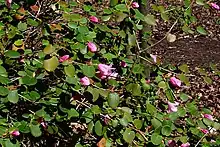 Growing to 1.5 m (4.9 ft) tall and broad, it is a compact evergreen shrub with rounded matt green leaves and rose pink bell-shaped flowers in spring.
