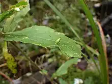 The galls are small, conical, and single-chambered, and typically occur on the lower side of leaves but sometimes on the upper side of leaves and on stems. Each gall contains a single white larva and is attached to either a major or minor vein when on leaves. On Solidago rugosa, the galls are 2.5–6 mm (0.10–0.24 in) long and .7–1.2 mm (0.03–0.05 in) wide at the widest part, tapering toward the apex, green to yellowish green, and covered by short, whitish hairs. Young galls may sometimes have a tuft of hair at their base, almost as long as the gall itself. [1]