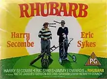 Rhubarb is a 1969 British short film written and directed by Eric Sykes, starring Sykes, Harry Secombe and Jimmy Edwards.[1] The dialogue consists entirely of repetitions of the word "rhubarb", all the characters' last names are "Rhubarb", the vehicle number plates are "RHU BAR B", and a baby "speaks" by holding a sign with the word "rhubarb" written on it. Sykes remade the film in 1980 as Rhubarb, Rhubarb for Thames Television.[2]