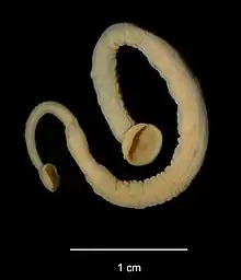 The Glossiphoniidae, the freshwater jawless leeches, or leaf leeches (due to their shape)[11] are freshwater leeches, flattened, and with a poorly defined anterior sucker.[2] The family Glossiphoniidae contains one of the world's largest species of leech, the giant Amazon leech, which can grow up to 45 cm in length.[12] Many species show extended parental care, keeping eggs in nests or pouches and caring for and feeding the young.[2][13] They feed on both vertebrate and invertebrate animals.[4]