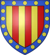 Arms of Basset of Weldon: Paly of six or and gules, within a bordure azure bezantee.[1]
