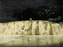 After completing his Dunkirk painting and a number of other short-term commissions for WAAC, Eurich was given a full-time commission to paint Admiralty subjects. This commission lasted from 1941 to 1945 during which time he painted, sometimes, epic reconstructions of battle scenes, depictions of survival stories and also simpler paintings of ships and boats.[4] Some of these works were based on locations and vessels Eurich was familiar with, such as his paintings of British fishing boats and of naval actions off the south coast of England. To ensure accuracy, Eurich made several trips on destroyers patrolling the Straits of Dover during the war. Other paintings were based on photographs and eyewitness accounts and some were wholly works of imagination.[2] This last category included Survivors From a Torpedoed Ship showing exhausted men clinging to the upturned hull of their lifeboat.[5] Although the painting was greatly praised, by Winston Churchill among others, WAAC quickly withdrew it from public display fearing it would adversely affect recruitment to the Merchant Navy.[2] Eurich painted reconstructions of British Commando raids on Vaagso, Bruneval and Dieppe. For the Dieppe raid, Eurich was given access to the operations room for the attack and listened to the British radio communications as events developed.[2][6] During the war, Eurich also painted scenes representing the D-Day landings, the Battle of Salerno, the wreck of the Tirpitz and air attacks on a convoy.[4] In total during the war, Eurich completed some 34 oil paintings and one drawing for WAAC.[2]