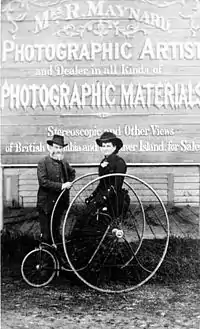 It is likely that Maynard learned the skill of photography from his wife, and his earliest known photograph is an 1864 panorama of Victoria.[5] In 1868, he took his first long distance trip, up the Cariboo Road to the gold mining town of Barkerville, accompanied by his eleven-year-son Albert, nicknamed "The General", who kept the miners entertained with magic tricks and acrobatics.[4] Two years later, Maynard returned alone to his hometown of Bude, and on the way back he stopped to purchase photographic supplies in New York City.[4] In May and June 1873, he received a government commission aboard the gun boat HMS Boxer which journeyed first to New Westminster, then up the east coast of Vancouver Island, continuing past along the mainland as far north as Bella Coola.[6] On the voyage was the first federal Superintendent of Indian Affairs for the province of British Columbia, Israel Wood Powell, and Maynard's role was to document native affairs for the official report.[7][8] His photographs included the first views of free-standing totem poles among the Kwakwaka'wakw at Klinaklini River,[9] and in Takush Harbour, he took six field portraits of villagers seated against the backdrop of a Hudson's Bay Company blanket.[10] The next year, Maynard was again the photographer on a similar mission with the same vessel, this time on a circumnavigation of Vancouver Island.[11] The photographic results were disappointing due to the incessant bad weather,[12] although his most important images were taken at Yuquot on Nootka Sound.[13]
