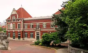 Four years after the completion of the Nashville station, Montfort was employed to design another new L&N station in downtown Knoxville, Tennessee, the largest city in the eastern third of the state and a gateway to Appalachia. He designed a tile-roofed red-brick depot in a Chateauesque/Flemish-Renaissance-revival style whose headhouse served as the stub-end terminus for the L&N rail lines entering the city, meaning the trains had to decouple their locomotives and hook up to a different one at their opposite ends to enter and leave the station. Its construction was desired by the L&N after the completion of the Southern Railway's grand passenger and freight complex on the north side of downtown in 1903 by its noted house architect Frank Pierce Milburn.[16] Opened on 10 April 1905, Montfort's station almost immediately became a regional landmark: James Agee described its "smouldering" stained glass and referenced it multiple times in his novel A Death in the Family, set in Knoxville in 1915.[17] After the L&N abandoned all service to Knoxville in the 1960s, the vast rail yards behind the station were then redeveloped into what would become World's Fair Park, the site of the 1982 World's Fair. The station itself, which served as a restaurant during the event, has recently been converted (appropriately, given Montfort's engineering training) into a high-performing municipal math-and-science public magnet school.[18]