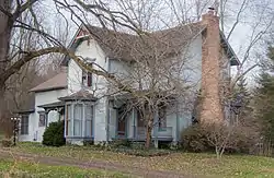 The house has four matching porches with cutwork trim, which give the house a distinctive appearance. The porches are identical, and are located in the four angles formed by the intersection of the wings. The porches have low-pitched hipped roofs supported by corner brackets on square chamfered-edge columns. Between supports is a turned spindle balustrade. Other decorative elements include pinwheel patterns on the gables and sawtooth trim on gables edges. [2]