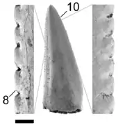 In 2001, Julia Sankey named a second species: Richardoestesia isosceles, based on a tooth, LSUMGS 489:6238, from the Texan Aguja Formation, which is of a longer and less recurved type.[6] The teeth of R. isosceles have also been identified as crocodyliform in shape, possibly belonging to a sebecosuchian.[7]