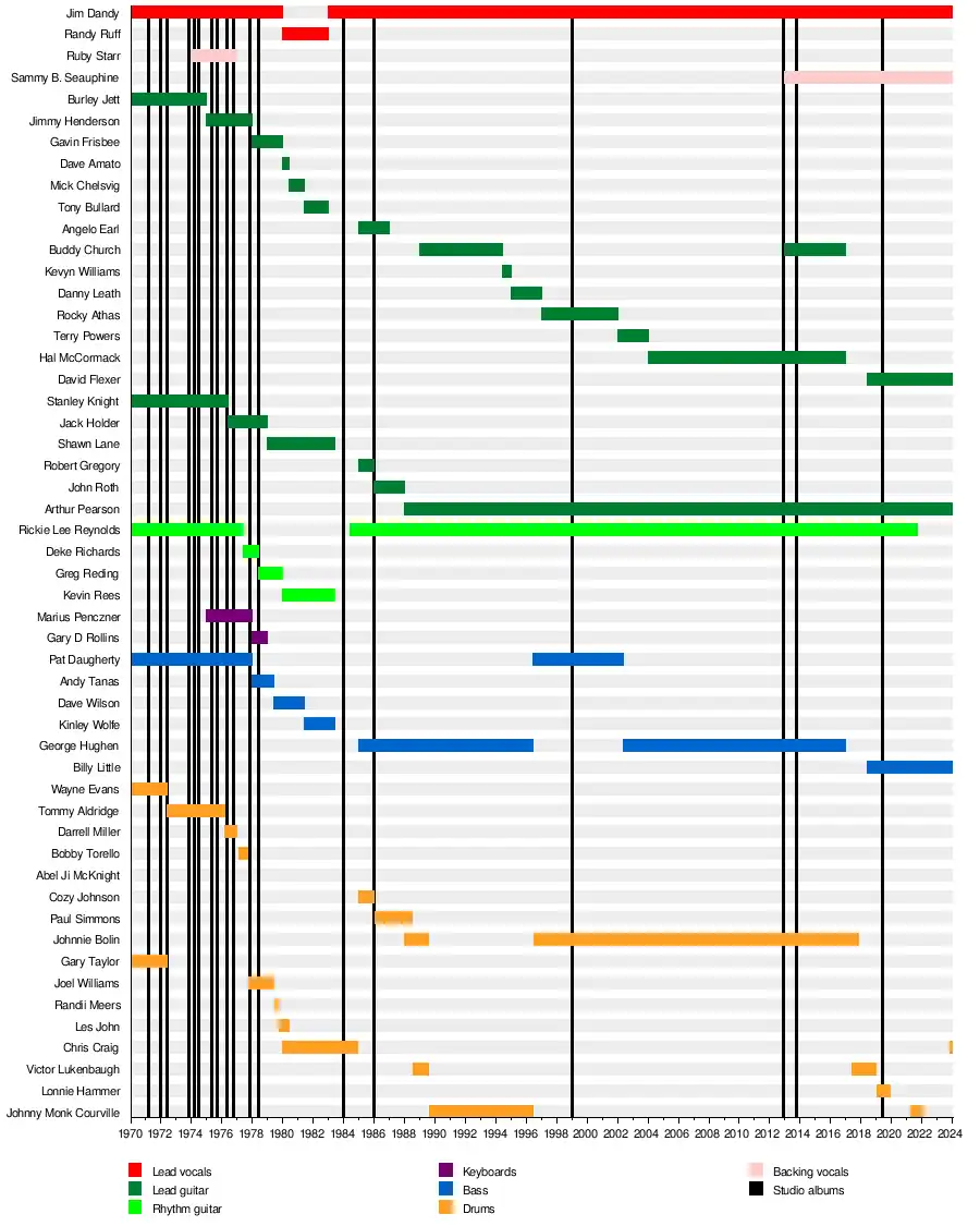 Original and long-time guitarist Rickie Lee Reynolds (born on October 28, 1948, in Manila, Arkansas) died on September 5, 2021, after being hospitalized due to COVID-19 and then suffering from kidney and heart failure, at the age of 72.[9][10]
