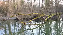 In the Quaternary period, while the Rhine rift was subsiding, sediment made up of sand and gravel coming partly from the Vosges but above all from the Alps built up. The sediment thickness reaches 75 m in Strasbourg, 250 m in Neuf-Brisach, and 150 m in Mulhouse.[3] Sand coming from the Vosges shows a higher tourmaline content, whereas sand coming from the Alps, which makes up the major part of the sand encountered in the Ried, is characterised by a combination of heavy minerals (green hornblend, epidote and garnet ).[4] Formerly, the Rhine was flowing into the Rhone, until the barrier constituted by the Kaiserstuhl disappeared. Thanks to their porosity, these weak rocks house Europe's largest water table. The estimated water quantity amounts to 300 billions cubic metres (of which 50 billion is only in Alsace).[5] Numerous sand and gravel pits can be encountered in the Ried, thus making Alsace one of the most productive regions in France, in terms of building materials.