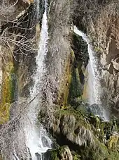 Rifle Falls State Park is a Colorado State Park located in Garfield County northeast of Rifle, Colorado. The central feature of the 48-acre (0.19 km2) park is a triple 70-foot (21 m) waterfall flowing over a travertine dam on East Rifle Creek. Commonly seen wildlife includes mule deer, elk, coyote, and golden-mantled ground squirrel. Rainbow and brown trout can be caught in the creek. Limestone cliffs near the falls have a few small caves and three species of bats. Visitor facilities include campsites, picnic sites and 2.0 miles (3.2 km) of hiking trails.