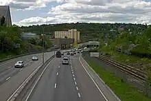 Adolf Hedins vei is part of Ring 3, here with Manglerud to the left and Ryen up ahead. To the right the Lambertseter Line of the Oslo Metro