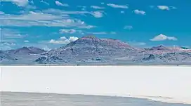 Rishel Peak is situated in the Silver Island Mountains which are a subset of the Great Basin Ranges, and it is set on land managed by the Bureau of Land Management. The community of Wendover, Utah, is eight miles to the southwest and the Bonneville Speedway is seven miles to the east-southeast. Topographic relief is significant as the summit rises 2,000 feet (610 meters) above the Bonneville Salt Flats in 1.5 mile. This landform's toponym was officially adopted in 1960 by the U.S. Board on Geographic Names to honor William D. "Bill" Rishel (1869–1947), who in 1907 was the first to test the suitability of the salt flat for driving by taking a Pierce-Arrow onto its surface.[4][6][7]