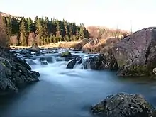 The Duddon is a river of north-west England. It rises at a point 1,289 feet (393 m) above sea level near the Three Shire Stone at the highest point of Wrynose Pass (grid reference NY277028). The river descends to the sea over a course of about 15 miles (24 km) before entering the Irish Sea at the Duddon Sands. In total, from source to the westernmost part of Duddon Sands, its length is 43 kilometres (27 mi). For its entire length the Duddon forms the boundary between the historic counties of Lancashire and Cumberland and since local government re-organisation in 1974 the Duddon has been in the ceremonial county of Cumbria.