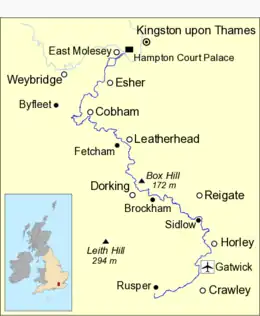 ![]() Map showing the River Mole (dark blue) and part of the River Thames (light blue) | |