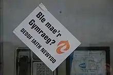 An example of a "Ble mae'r Gymraeg?" campaign sticker on a telephone box at Llangybi, Gwynedd, which translates as Where's the Welsh? New Language Act