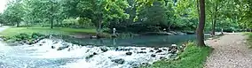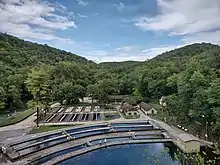 • Dam/Spillway (NRIS 85000518): The original stone and earthen dam was built in 1865 by William McClure to power McClure's Mill (destroyed c. 1920). The dam was reconstructed by the CCC in 1933 for an important fish hatchery complex.[9]