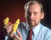 Michelson holding one of his aerial robotic inventions: the Entomopter (U.S. Patent No. 6,082,671)