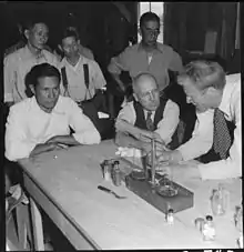 ![]() Robert Emerson (right) discusses an experiment with the nursery staff of the Manzanar Guayule Rubber Project (June 28, 1942). | |