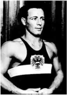 In the event for which he was likely best known, Fein competed in weightlifting at the 1936 Summer Olympics in Berlin, Germany.[4] He won the gold medal in the lightweight class with a world record lift of 342.5 kilograms (755 pounds), with splits of 105+100+137.5, sharing the win with Anwar Mesbah, with whom his match had ended in a tie. Sixteen weightlifters from twelve nations competed. Fein became one of only thirteen Jewish Olympians to medal in the games which were held during Adolph Hitler's Nazi government, and following the imposition of the anti-Semitic Nuremberg laws. The Nuremberg Laws, passed in the fall of 1935, stripped German Jews of citizenship, opportunities to receive a public education, and access to many professions and public facilities. Jewish businesses had been boycotted and Jews could not serve in the legal profession, the civil service, teach in secondary schools or universities or vote or hold public office.[5][6][2] [7][8]