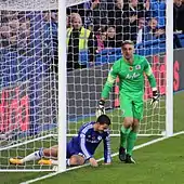 Green was sent off for the first time in his club career[28] against Blackpool on 21 February 2012. West Ham, who had not named a substitute goalkeeper in their squad for the match, were forced to play the remainder of the second-half with midfielder Henri Lansbury in goal. They eventually won 4–1.[29] West Ham later won an appeal against the red card leaving Green available to play in their next match.[30] He played 42 of West Ham's 46 match 2011–12 Championship season playing in the play-off final at Wembley Stadium which West Ham United won, sealing their immediate return into the Premier League.[31][32] In June 2012, after West Ham and Green failed to agree new terms at the end of his contract, joint-chairman David Gold announced Green's departure from the club.[33]