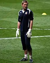 Green was named in England's squad for the 2010 FIFA World Cup.[87] Manager Fabio Capello opted not to name his first choice goalkeeper until the day of England's opening match, against the United States on 12 June, at which point he selected Green to start.[88] With England leading 1–0 in the 40th minute, Green failed to save a long-range shot from U.S. midfielder Clint Dempsey, which bounced off his gloves and into the net.[89] The match ended in a 1–1 draw. Following this error and an unconvincing final training session on 17 June, Green was dropped. He was replaced by David James who played in England's next match, a 0–0 draw against Algeria on 18 June.[90][91] He did not appear again in the World Cup and was omitted from the first England squad named after the tournament for a friendly against Hungary.