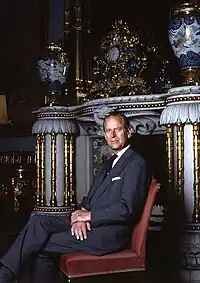 The Duke of Edinburgh seated in the Chinese Luncheon Room at Buckingham Palace. The chimneypiece was designed by Robert Jones and sculpted by Richard Westmacott. It was formerly in the Music Room at the Brighton Pavilion.[1]