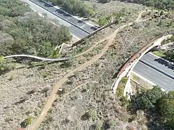 At 189 feet (58 m) long and 150 feet (46 m) wide,[4] it is the largest wildlife bridge in the United States as of December 2020.[5] With 8-foot (2.4 m) tall, noise damping corten steel walls on both sides, the bridge is designed to appear to crossers as a small hill.[6][7] The bridge has a 250,000-US-gallon (950,000 L) underground cistern to keep the bridge's plants irrigated via rainwater.[8]