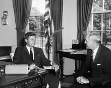 President John F. Kennedy meets with Robert M. McKinney, United States Ambassador to Switzerland. Oval Office, White House, Washington, D.C.