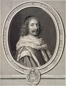 His crayon drawings and engraved portraits having attracted attention, by 1652 his work was in high demand.[3] By 1657 he was pensioned by Louis XIV and appointed designer and engraver of the king's cabinet.[5][6] It was mainly due to his influence that the king granted the edict of 1660, dated from Saint-Jean-de-Luz, by which engraving was pronounced free and distinct from the mechanical arts, and its practitioners were declared entitled to the privileges of other artists. Nanteuil's clientele included the Sun King himself, Cardinal Richelieu, Queen Christina of Sweden and many other high-ranking aristocrats and personages of note. Among the finest works of his fully developed period may be named the portraits of Pompone de Bellièvre, Gilles Ménage, Louis, Grand Condé, Jean Loret, the Duc de La Meilleraye and the Duchesse de Nemours.[5]