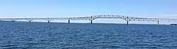 The Robert Opie Norris Jr. Bridge is a truss bridge that spans the Rappahannock River in Virginia, United States and serves as the crossing for State Route 3 over the river between Grey's Point on the Middlesex County side and the town of White Stone in Lancaster County. The span was opened on August 30, 1957, and replaced a ferry service directly West of where the current bridge is located. Commonly known by locals as the White Stone Bridge or Rappahannock River Bridge, this span is a critical crossing between the Lower Middle Peninsula and the Northern Neck as the next closest crossing is over 30 miles (48 km) upstream near Tappahannock. Traffic forced to utilize a detour over the upstream crossing could potentially travel over 90 miles (140 km). The Norris Bridge is 11,237 feet (3,425 m) long,[1] and provides a Mean High Water clearance of 110 feet (34 m) under the center span with a channel depth of over 60 feet (18 m). The bridge is maintained by the Virginia Department of Transportation. When first opened, the bridge was crossed by just over 1,000 vehicles per day, on average. Tolls were removed from the bridge in 1976, and by 1978 the average daily traffic had risen to over 2,500 vehicles per day. By 2006, traffic counts reached 11,309 vehicles per day[2] but shrank to 6,900 Annual Average Daily Traffic in 2017.[3]