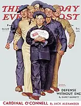 Willie Gillis was a freckle-faced All-American character who served as one of Rockwell's main coverboys during World War II.[15] The Gillis character is widely referred to as an everyman who epitomized the typical American World War II soldier.[16][17][18][19] Rockwell created Gillis in 1940 as the European Theater of World War II was escalating and Americans were enlisting or being drafted into the armed forces under the Selective Training and Service Act of 1940. Rockwell credits the name Willie Gillis to his wife,[20] who derived it from the old nursery rhyme Wee Willie Winkie.[1] Rockwell described Gillis as "an inoffensive, ordinary little guy thrown into the chaos of war".[6] The public identified with Rockwell's portrayal of the "little guy" living up to a sense of duty in this time of war.[6] Gillis was truly seen as the typical G.I.,[19] and Rockwell's wartime art remains quite popular: his signed original May 29, 1943 depiction of Rosie the Riveter sold at a Sotheby's auction on May 22, 2002, for $4,959,500.[21] Some of the Willie Gillis paintings and the Rosie the Riveter painting were raffled off during the United States Department of the Treasury's Second War Loan Drive,[21] which ran from April 12 – May 1, 1943.[22] The Gillis character endures generations later for literary and artistic comparison.[15]