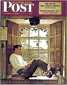 Buck had been exempted from the military draft, but he felt that serving his country was his patriotic duty and enlisted as a naval aviator in 1943.[34] He served in the South Seas during the war.[20] Rockwell worked from memory and photographs to complete his illustrations while Buck was overseas,[5] and sometimes he only worked Gillis into the background via a photograph on the wall.[4] He was going to discontinue the series, but Post editors objected because his character was too popular.[5] The public enjoyed closely scrutinizing Gillis' affairs.[35] Gillis was so popular that the Post received hundreds of letters inquiring about his tribulations, as many perceived him as real, and concern was particularly high among families named Gillis.[6]