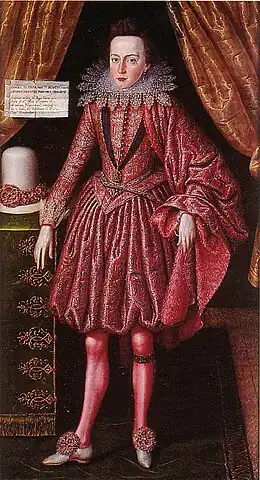 Peake is also listed in Sir David Murray's accounts for the period between 1 October 1610 and 6 November 1612, drawn up to the day on which Henry, Prince of Wales, died, possibly of typhoid fever, at the age of eighteen: "To Mr Peake for pictures and frames £12; two great pictures of the Prince in arms at length sent beyond the seas £50; and to him for washing, scouring and dressing of pictures and making of frames £20.4s.0d".[24] Peake is listed in the accounts for Henry's funeral under "Artificers and officers of the Works" as "Mr Peake the elder painter".[25] He was allotted seven yards of mourning cloth, plus four for his servant. Also listed is "Mr Peake the younger painter", meaning Robert's son William, who was allotted four yards of mourning cloth.[26]