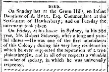 - ↑ The Sydney Gazette and New South Wales Advertiser. Dated 4 June 1809.