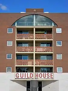 The architecture of Robert Venturi, although perhaps not as familiar today as his books, helped redirect American architecture away from a widely practiced modernism in the 1960s to a more exploratory design approach that openly drew lessons from architectural history and responded to the everyday context of the American city.[11] Venturi's buildings typically juxtapose architectural systems, elements and aims, to acknowledge the conflicts often inherent in a project or site. This "inclusive" approach contrasted with the typical modernist effort to resolve and unify all factors in a complete and rigidly structured—and possibly less functional and more simplistic—work of art. The diverse range of buildings of Venturi's early career offered surprising alternatives to then current architectural practice, with "impure" forms (such as the North Penn Visiting Nurses Headquarters), apparently casual asymmetries (as at the Vanna Venturi House), and pop-style supergraphics and geometries (for instance, the Lieb House).