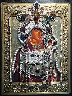 Icon decorated with pearls and gemstones on display at the museum | |